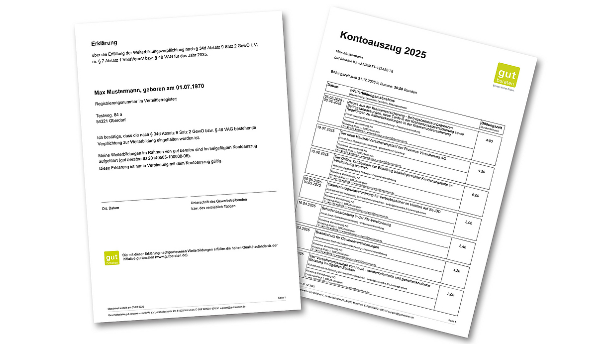 gut beraten bündelt die IDD konformen Bildungsmaßnahmen für jeden vertrieblich Tätigen individuell und übersichtlich in einem Bildungskonto – unabhängig vom Bildungsanbieter. Die Eintragung Ihrer Bildungsmaßnahmen werden durch unsere zertifizierten Bildungsdienstleister vorgenommen. Bildungsmaßnahmen nicht-zertifizierter Bildungsdienstleister können Sie über die Erweiterung Bildungskonto Plus durch die Geschäftsstelle gut beraten prüfen und ggf. eintragen lassen. Für die Erweiterung zum Bildungskonto Plus erheben wir einen jährlichen Kostenbeitrag von 16,66 EUR (brutto) – unabhängig von der Anzahl der durchgeführten Buchungen